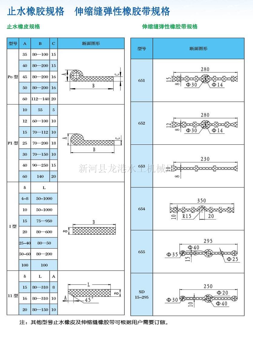 主要產品有:一:水電工程系列:橡膠水封.閘門水封.止水橡皮、橡膠止水帶、P型水封、P型止水帶、閘門止水帶。平板密封、主軸密封、入型、L型、U型等水電機組橡膠密封件。P型、雙P型、普通純膠水封、加帆布水封.無節型聚四氟乙烯復合水封.L型、山型、W型、方頭水封、疊梁門、弧門水封,排砂孔密封.止水橡皮等